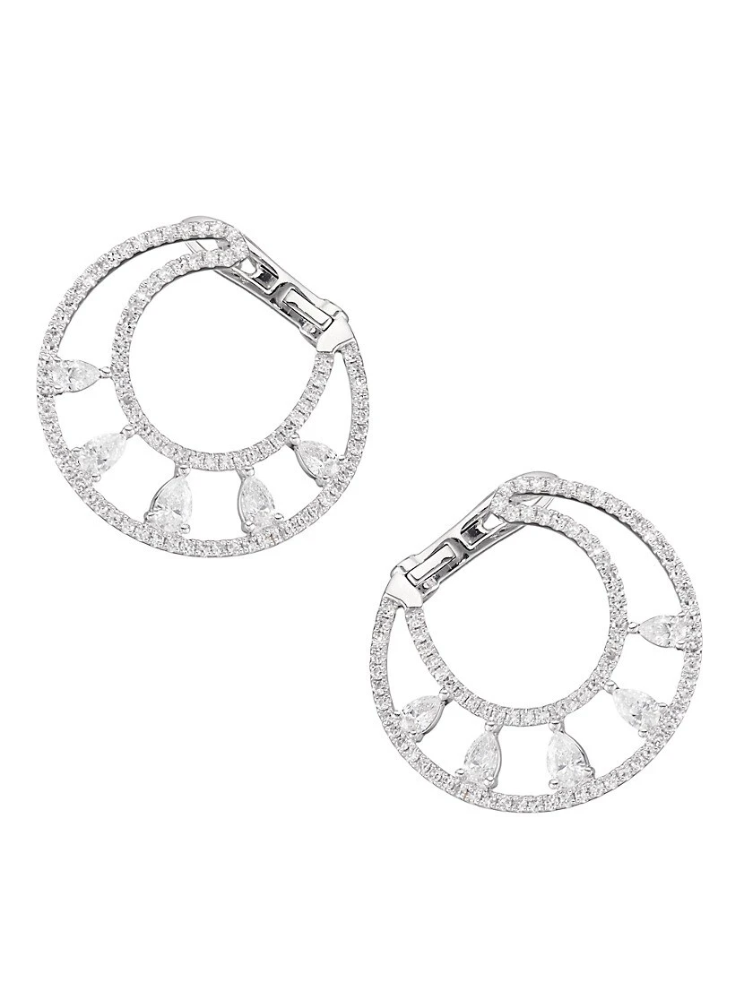 ONLY AT SAKS. Made of polished 14K white gold embellished with sparkling pavé and pear-shaped white diamonds, these stunning hoop earrings feature a unique silhouette that gently curves around the earlobe.