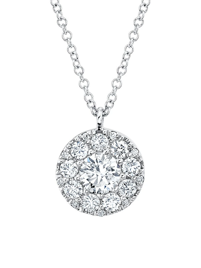 ONLY AT SAKS. Made of 14K white gold, Saks Fifth Avenue Collection’s necklace features a round pendant that glitters with clusters of brilliant-cut diamonds. This elegant embellishment is suspended from a delicate cable chain