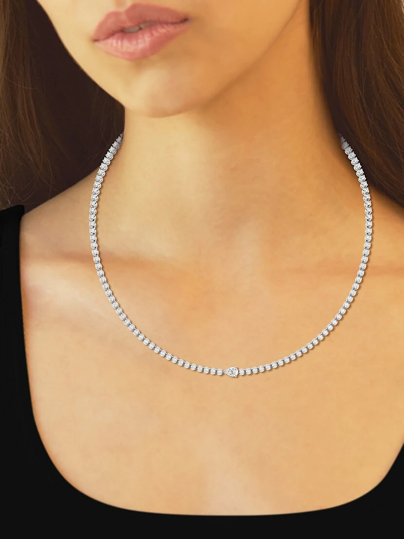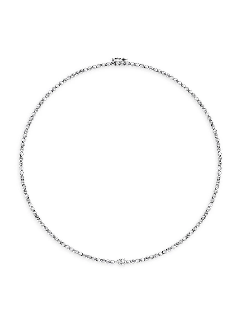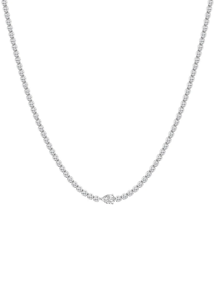 ONLY AT SAKS. Crafted of 14K white gold, Saks Fifth Avenue Collection’s tennis necklace beautifully sparkles with round diamonds and a single pear-cut diamond at the center.