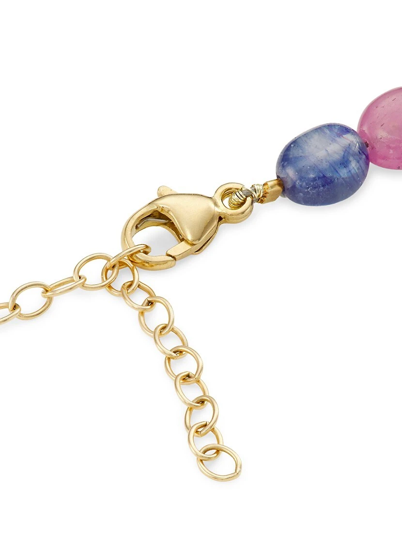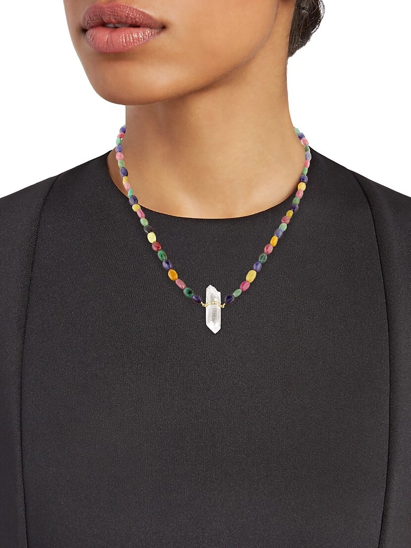Threaded with vibrant multicolored sapphire beads, Jia Jia’s necklace features a faceted clear quartz pendant. This stunning embellishment is accented with a band of shimmering diamonds pavé-set in 14K yellow gold.