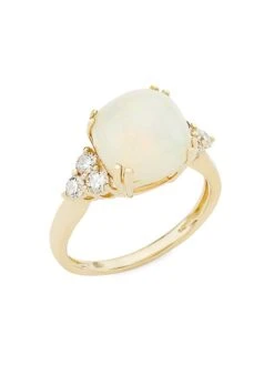 ONLY AT SAKS. Made of 14K yellow gold, Saks Fifth Avenue Collection’s ring features a luminous cushion-cut opal cabochon accented by trios of glittering round diamonds.