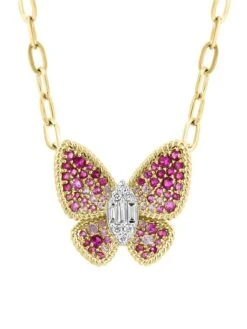 ONLY AT SAKS. Made of 14K yellow gold, Saks Fifth Avenue Collection’s necklace features a charming butterfly pendant set with sparkling pavé pink sapphires and round and baguette diamonds.