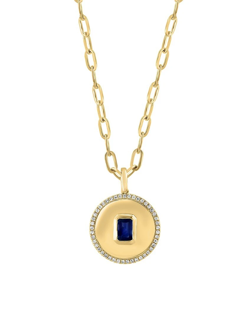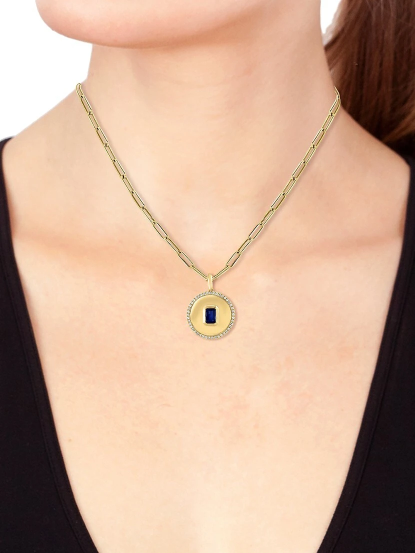 ONLY AT SAKS. Saks Fifth Avenue Collection’s 14K-yellow-gold necklace features a medallion pendant bezel-set with a vibrant emerald-cut blue sapphire. Accented by a halo of glittering pavé diamonds, this stunning embellishment hangs from a fine oval-link chain.
