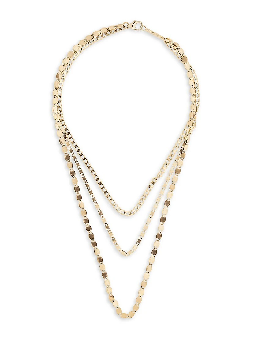 Made of polished 14K yellow gold, this eye-catching triple-strand anklet is composed of one curb chain and two flat-link chains.