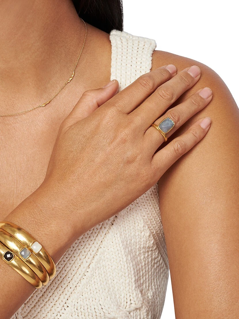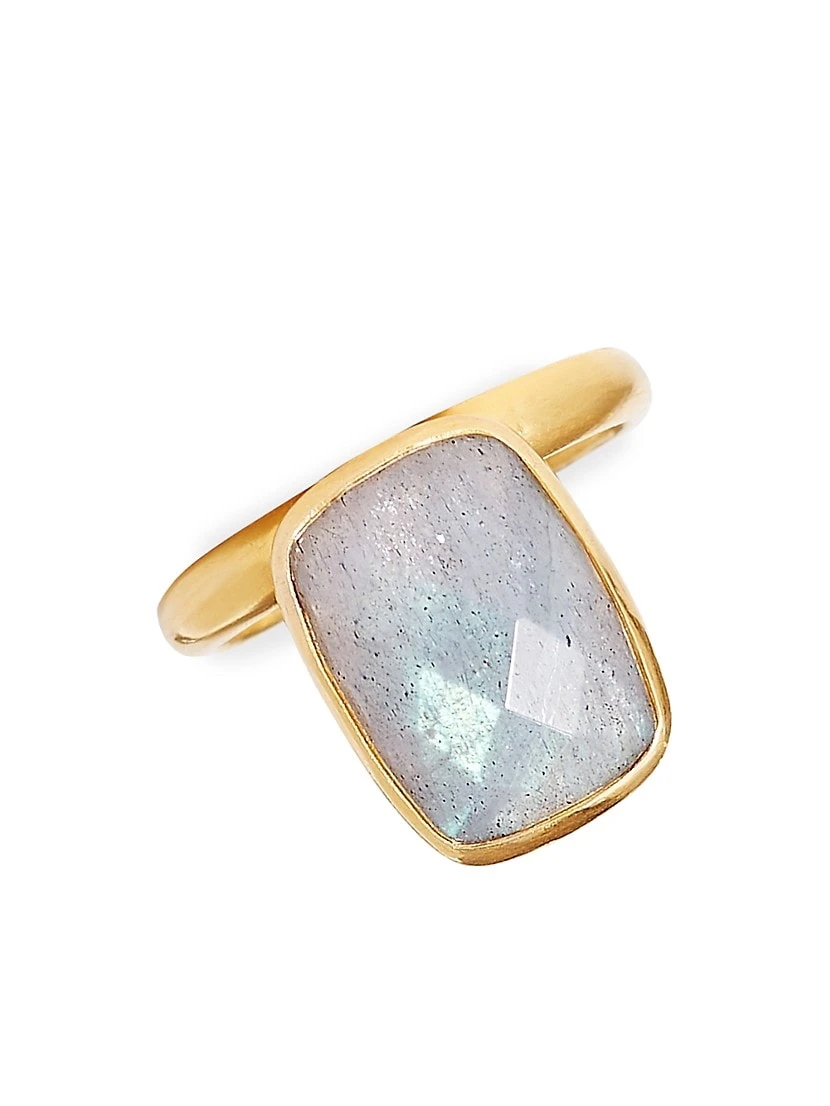 Adorned with a shimmering offset labradorite, this ring is handcrafted of polished 18K gold-plated sterling silver.
