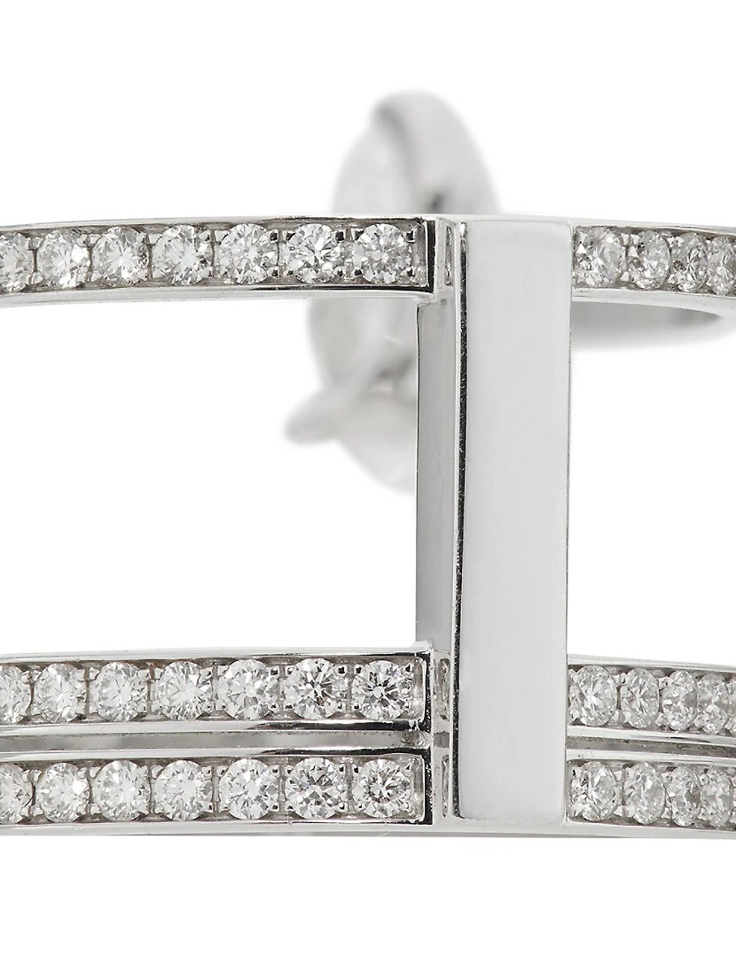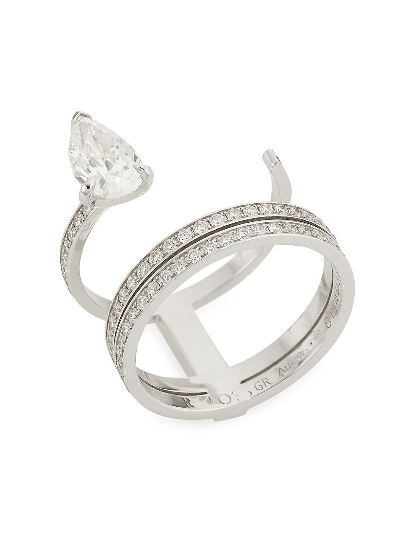 Designed with a signature openwork silhouette, this three-row ring features bar construction and a glittering pear-shaped diamond center.