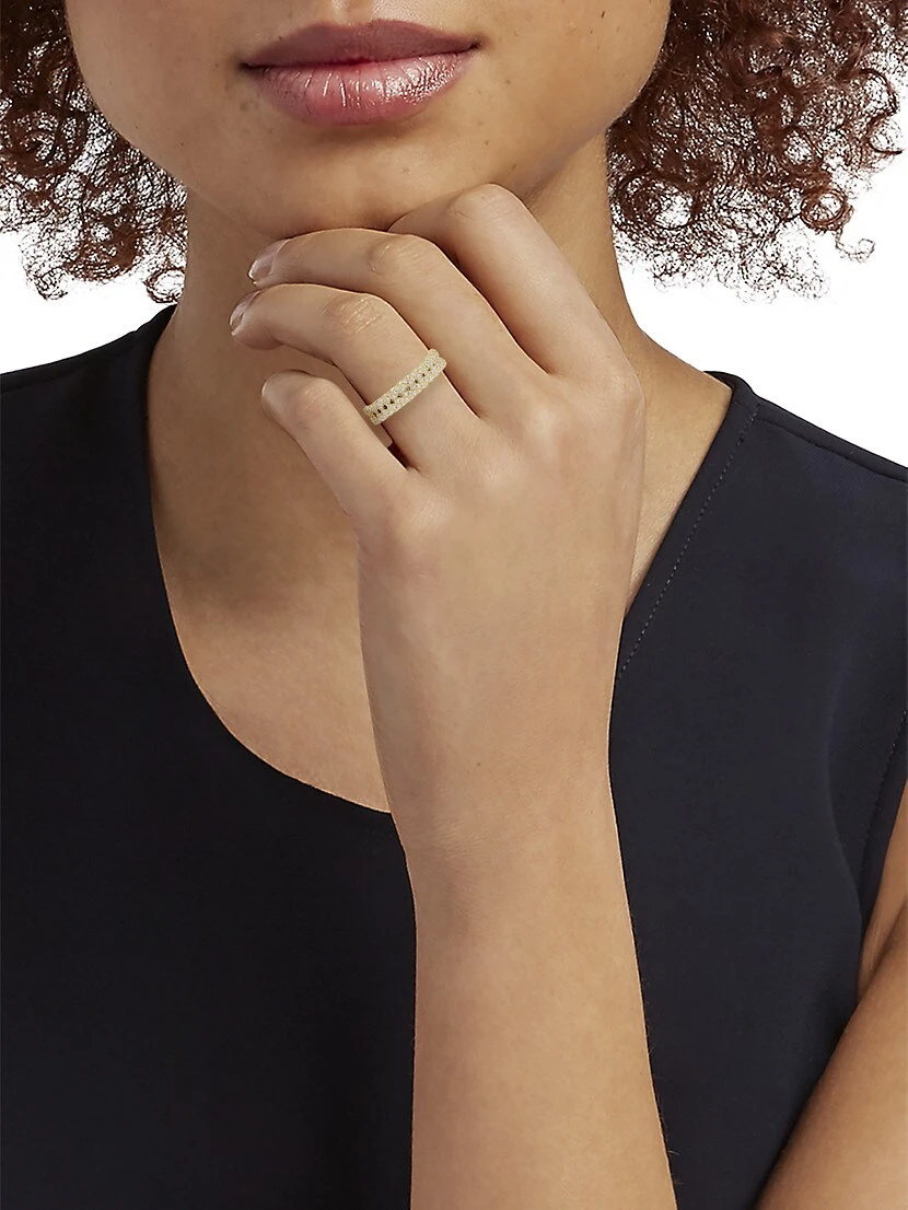 Crafted of polished yellow gold, this ring flaunts a braided motif topped with shimmering diamonds.