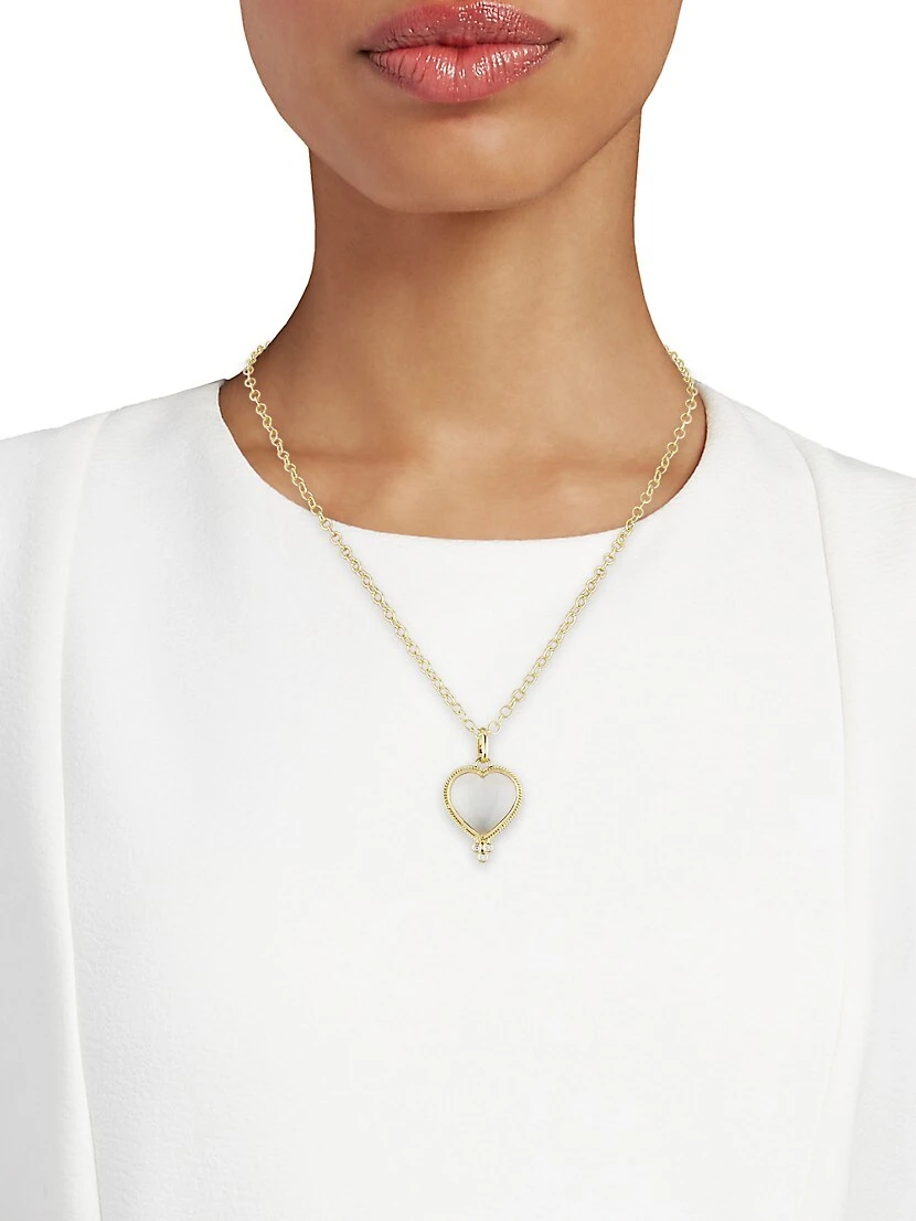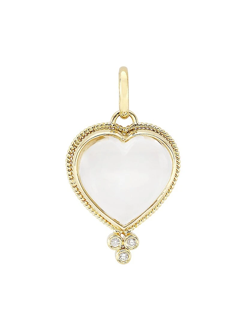 A shimmering heart rendered in smooth, translucent rock crystal within a braided framework of gleaming 18K yellow gold, accented with a trio of diamonds.
