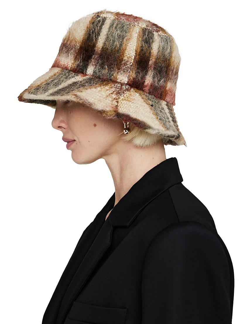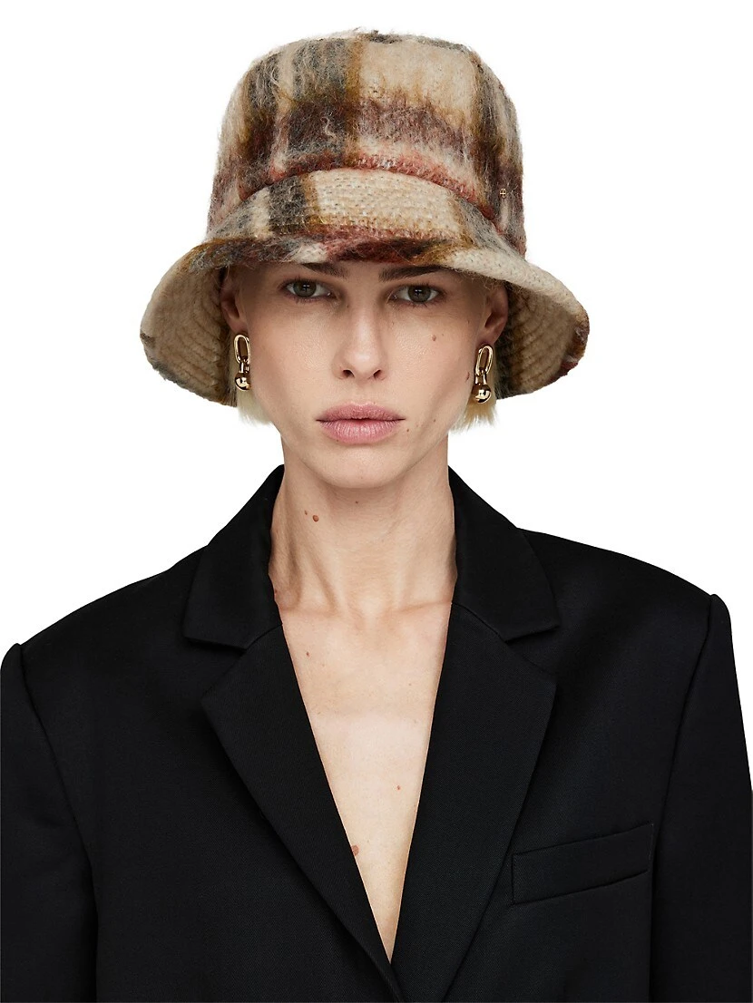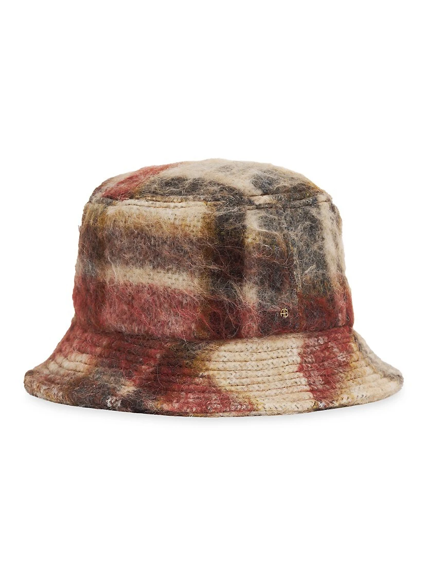 ANINE BING’s Cami bucket hat flaunts a fuzzy construction and a plaid print.