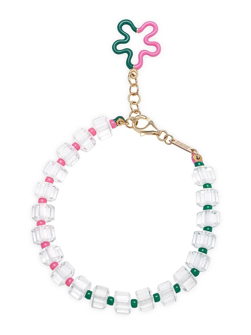 From the B Color Collection. Bea Bongiasca’s B bracelet is threaded with alternating rock crystal and pink and green glass beads. Handcrafted in Italy, this vibrant piece is finished with an enamel flower at the goldtone clasp.