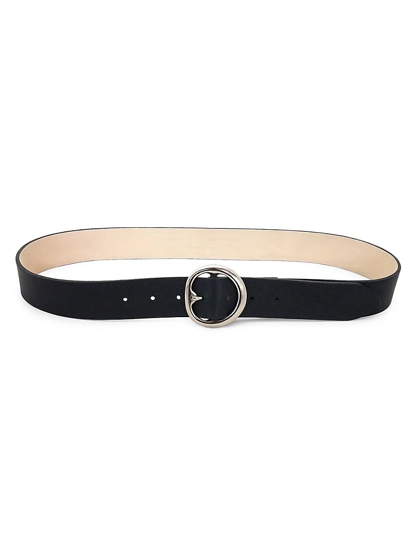 A gleaming silvertone round buckle lends a stylish finish to this sleek leather hip belt.