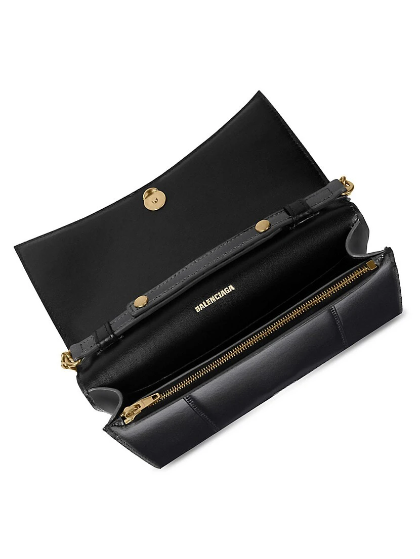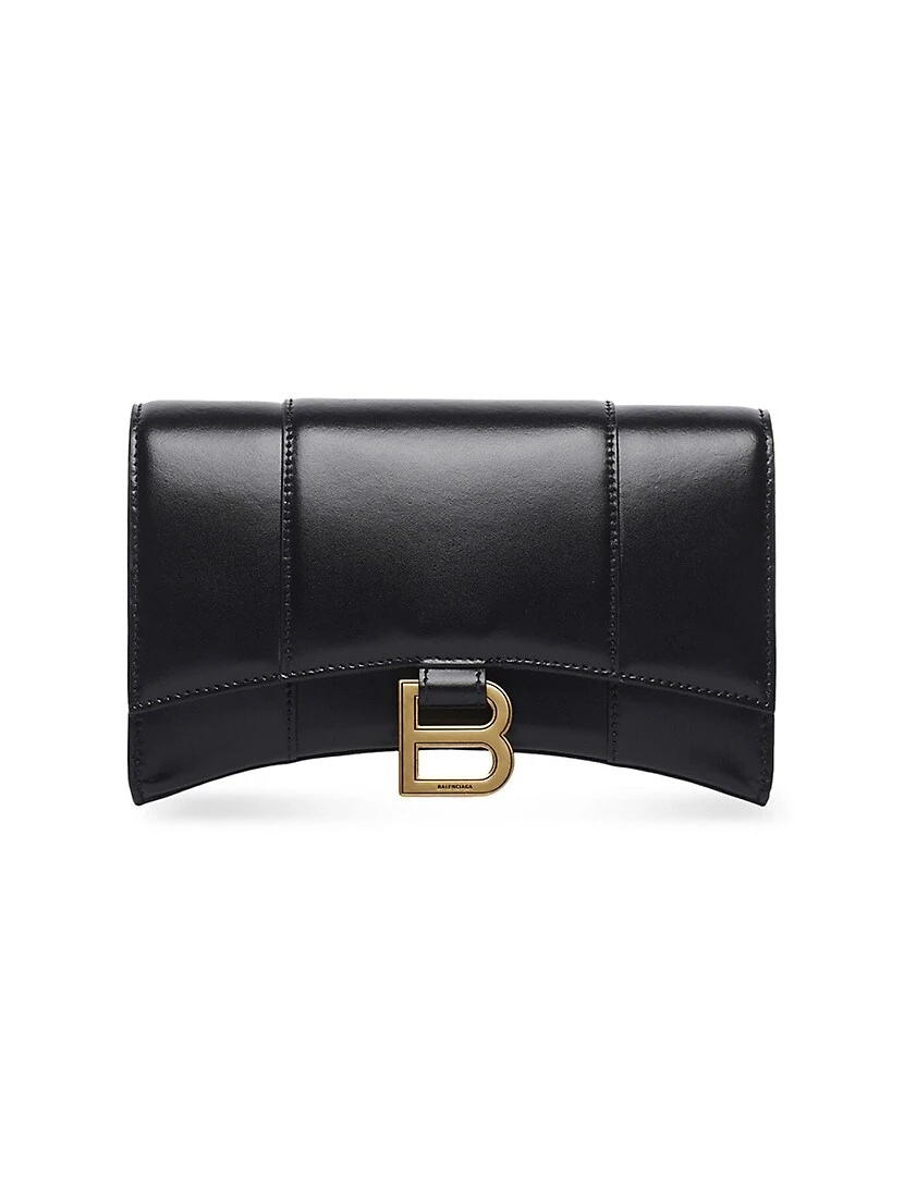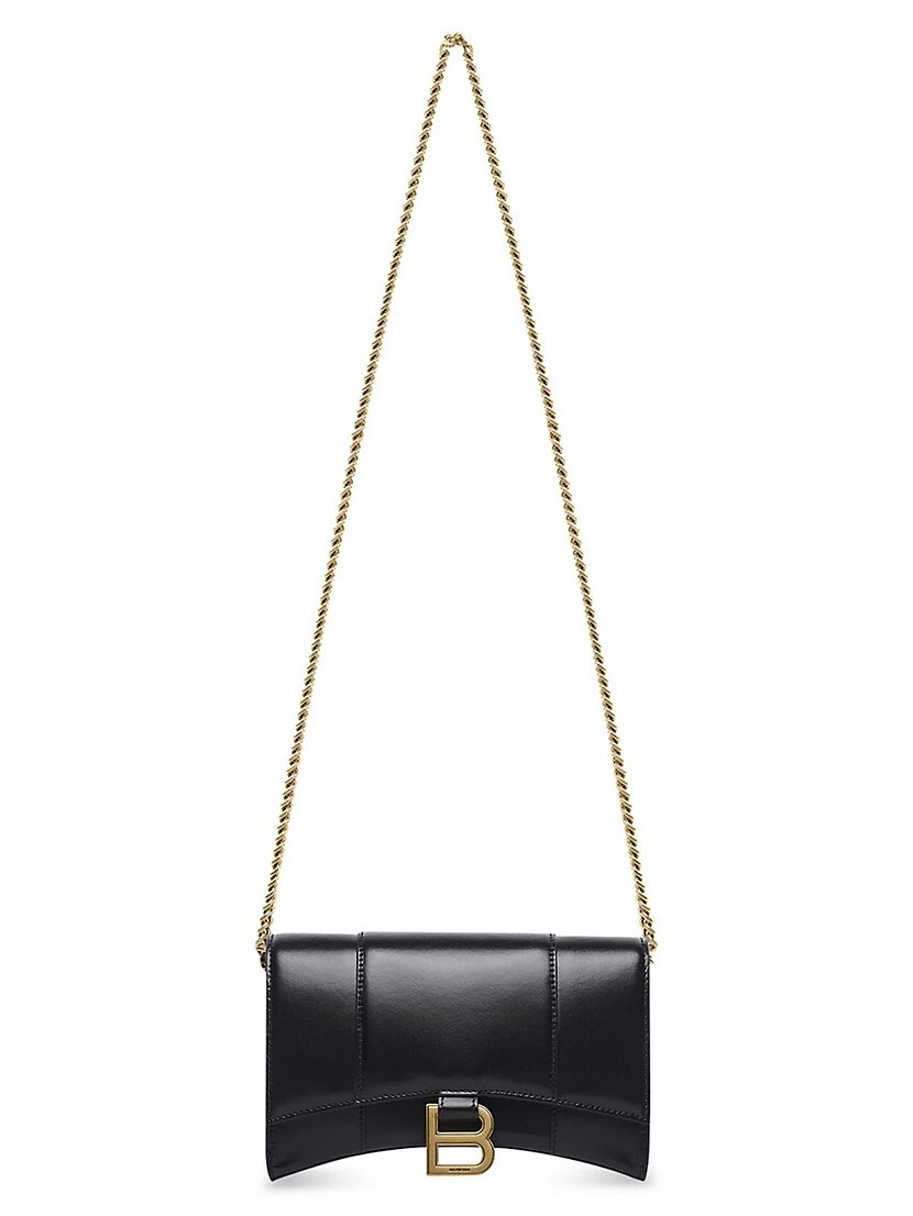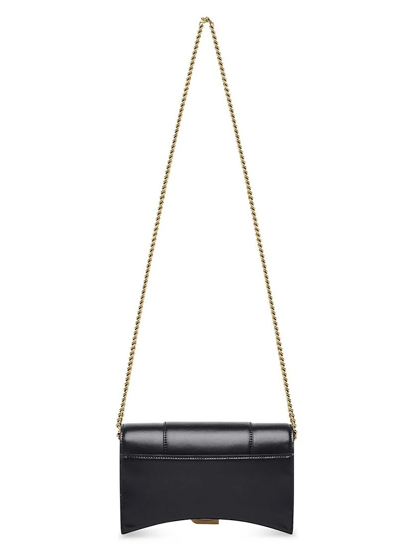 Hourglass Wallet On Chain in shyni box calfskin, aged-gold hardware.