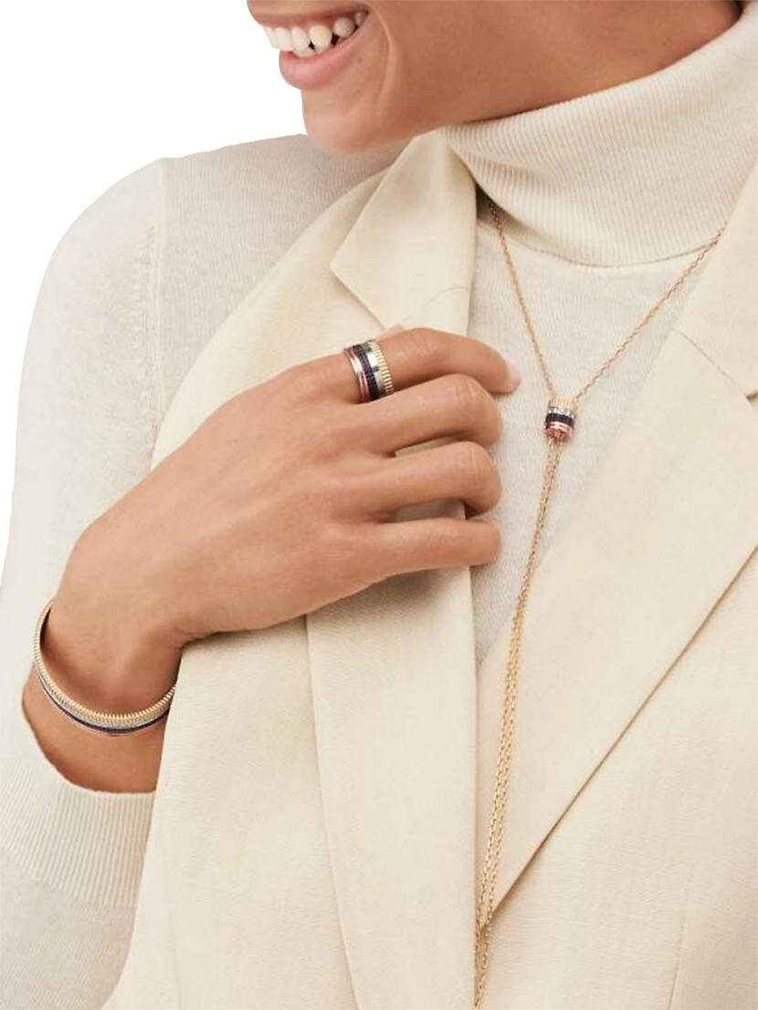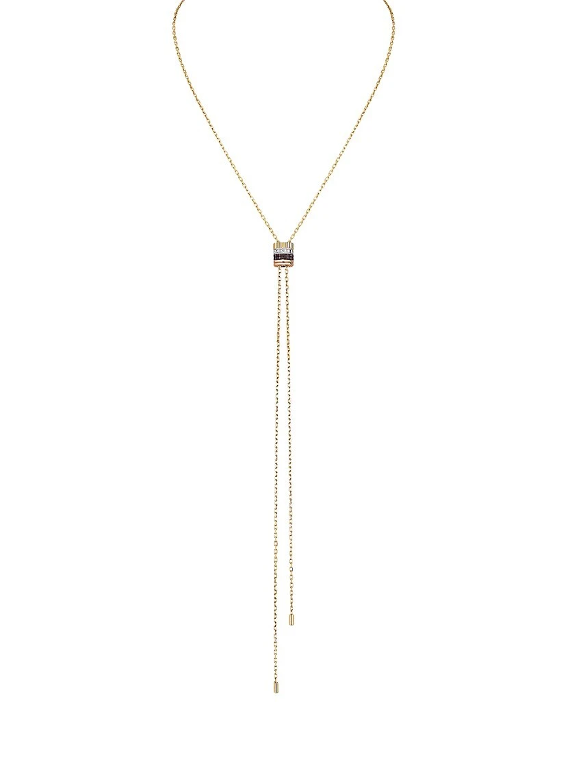 From the Quatre Collection. Inspired by Parisian architecture, the maison’s signature Quatre pendant is expertly crafted using various engraving techniques to create refined texture. Up, down, forwards, backwards, the diamond-accented Quatre motif dangles freely, threads of its own will as a clasp-jewel on a long, intense golden chain.