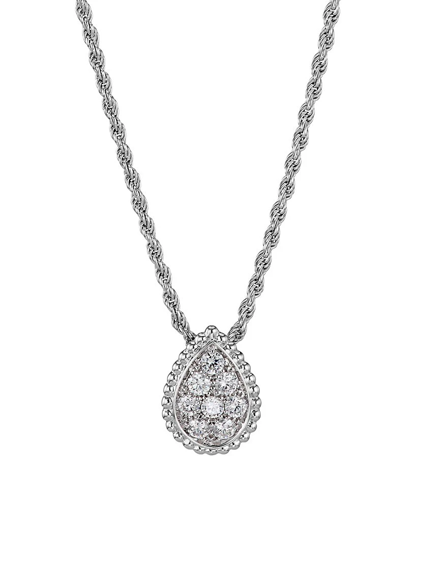 From the Serpent Boheme Collection. Made from 18K white gold, this stunning necklace features a teardrop pendant encrusted in dazzling diamonds set on a rope chain.
