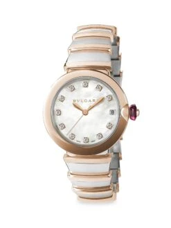 - White mother-of-pearl dial set with 11 diamond indexes with date aperture