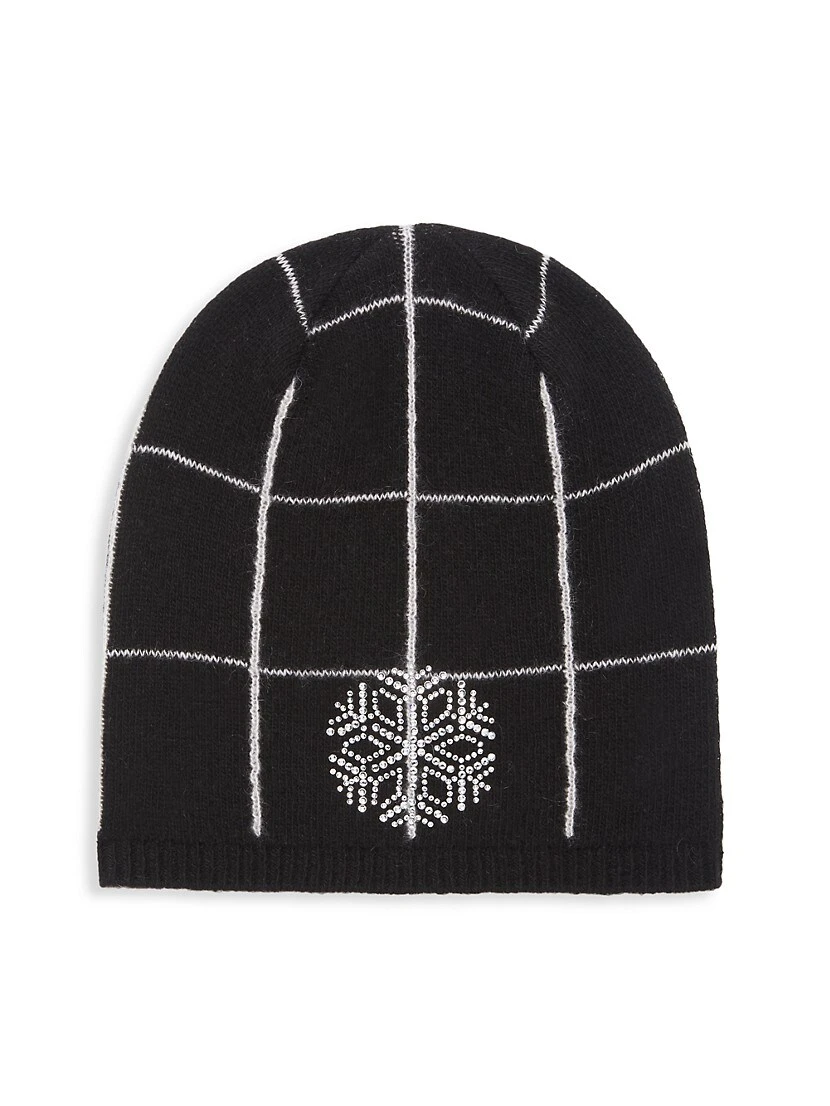 This cashmere beanie from Carolyn Rowan Collection is detailed with a windowpane print and finished with a crystal snowflake.