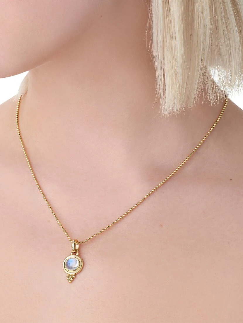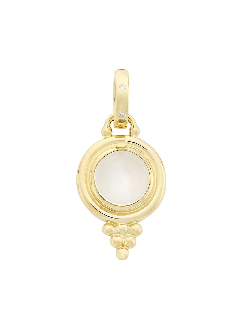 From the Classic Collection. A radiant golden halo suspends a luminous blue moonstone in this beautiful diamond-studded pendant.