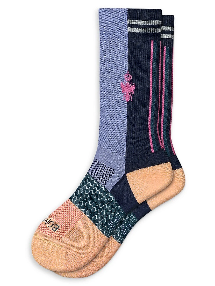 Bombas’ cycling socks are crew-length and feature a color-blocked pattern.