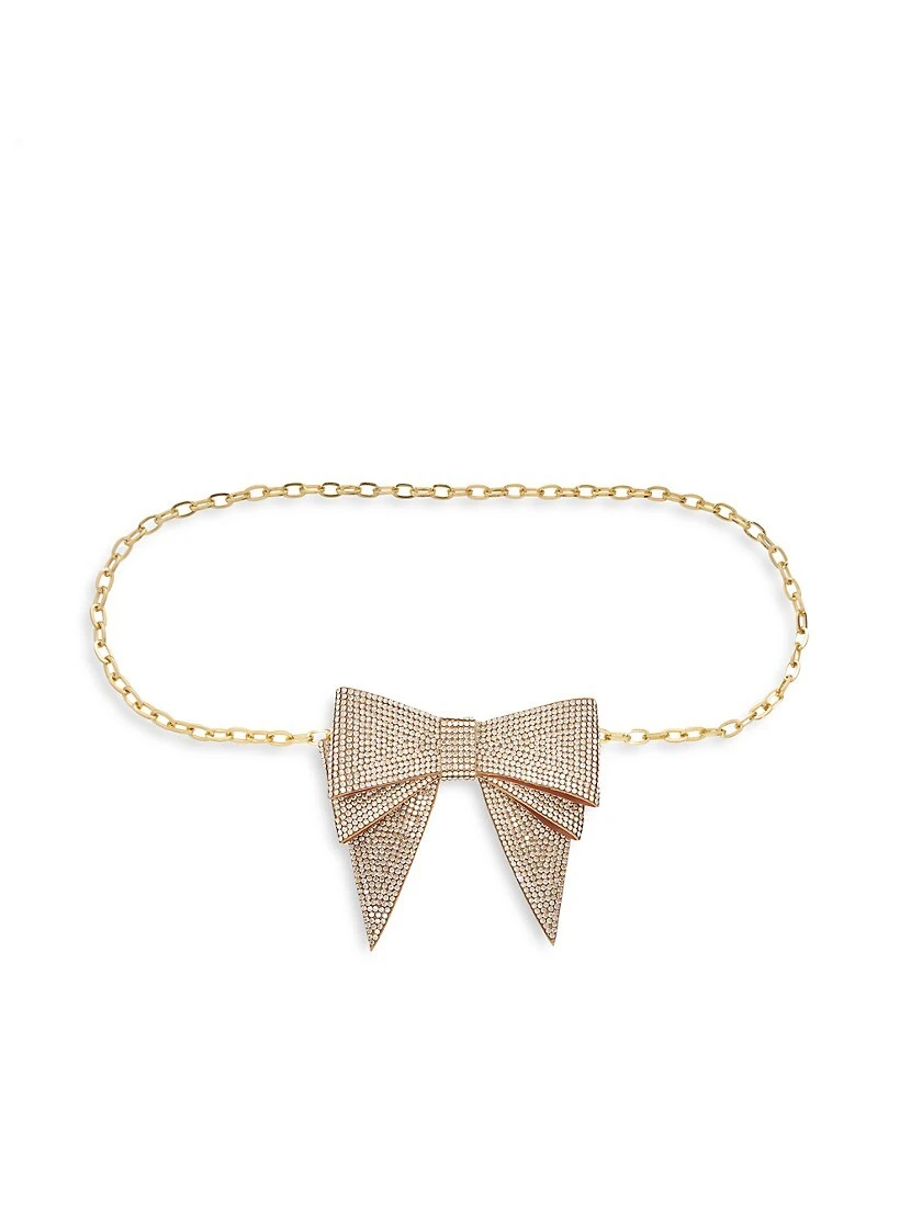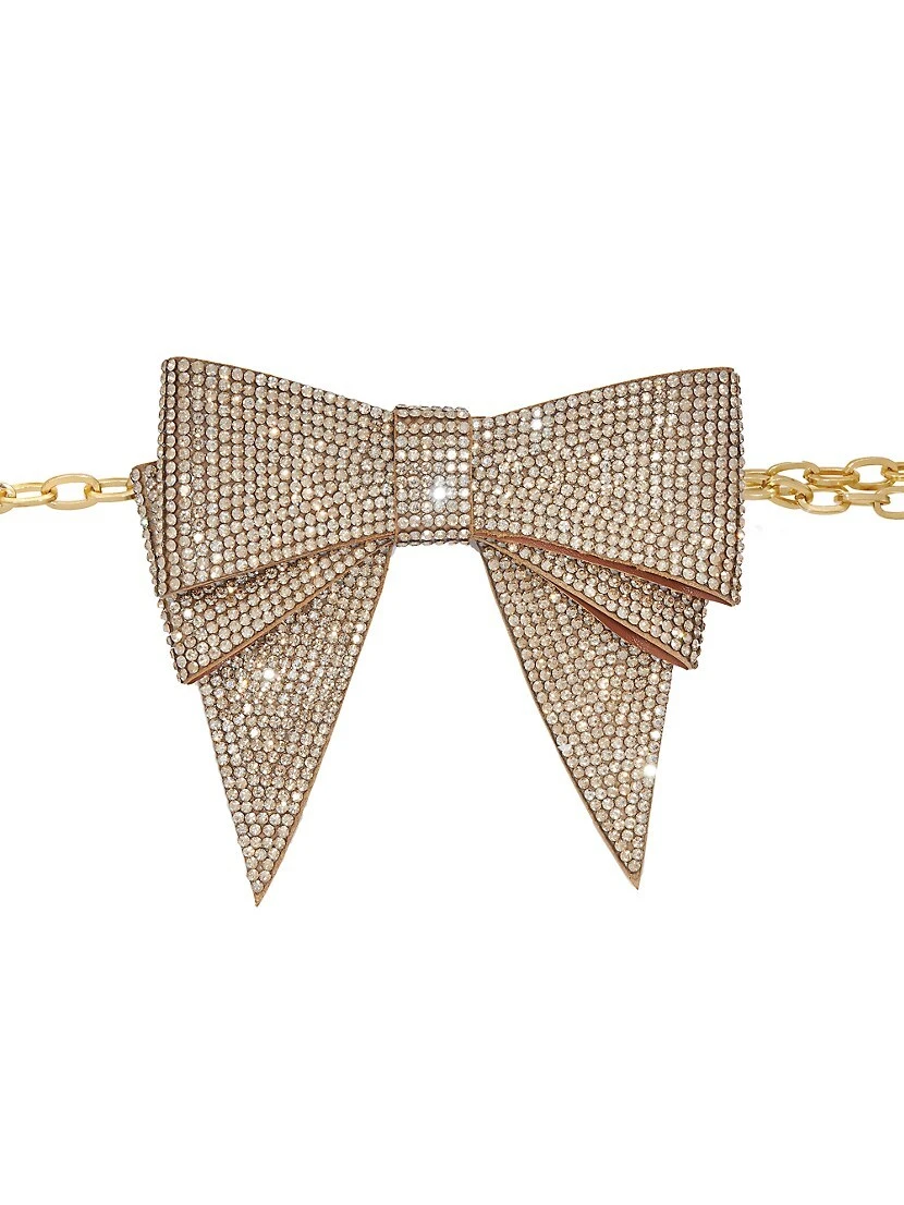 Judith Leiber’s chain belt is topped with a crystal-embellished bow accent.