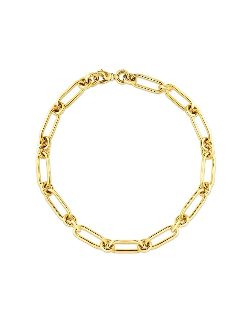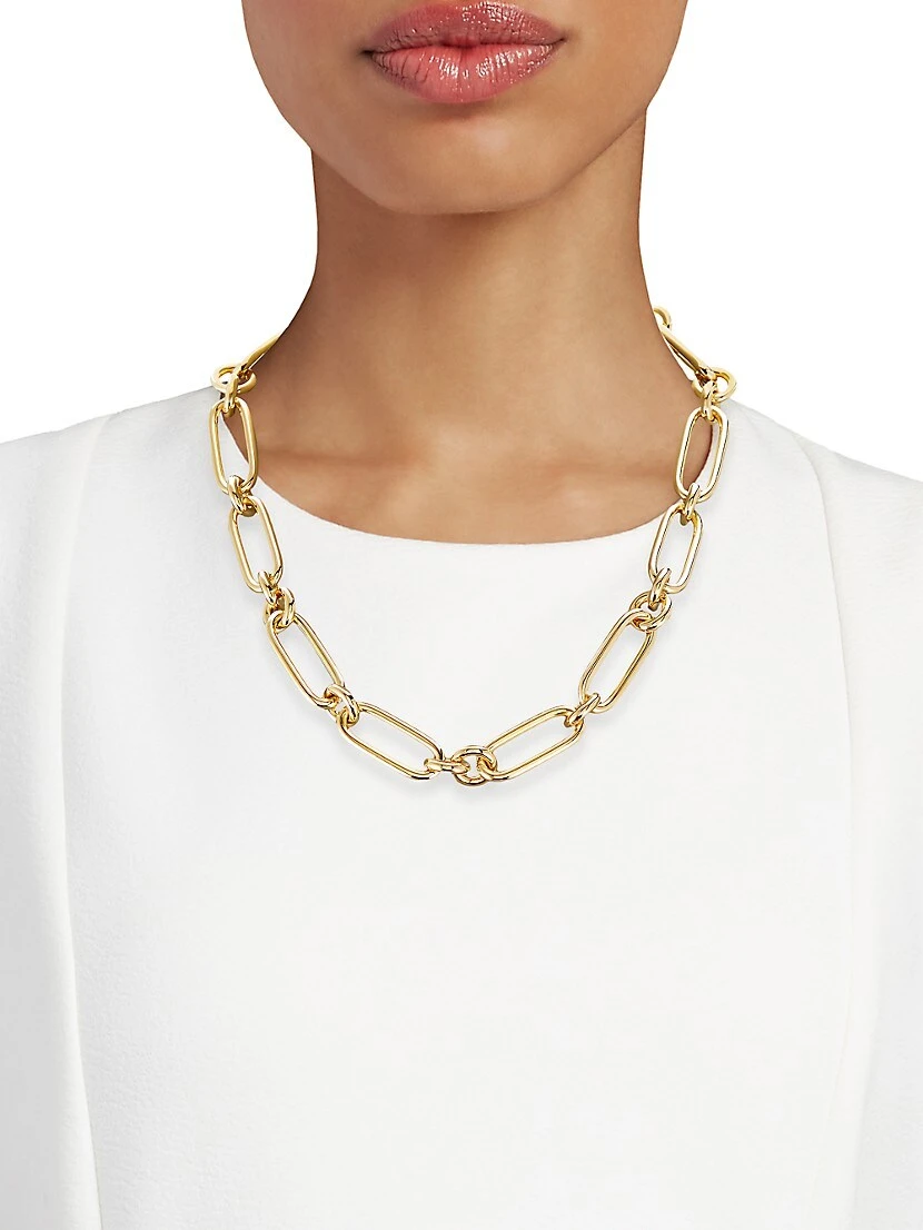 From the Designer Gold Collection. Signature openwork paperclip chain, centered by round links, comprises this radiant collar necklace.
