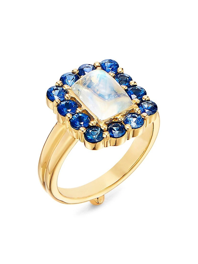 From the Dreamcatcher Collection. Crafted of 18K yellow gold, this ring features luscious blue moonstone and blue sapphires.
