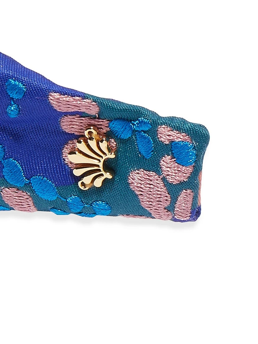 Lele Sadoughi’s knotted headband features embroidered jacquard construction with vibrant patterning.