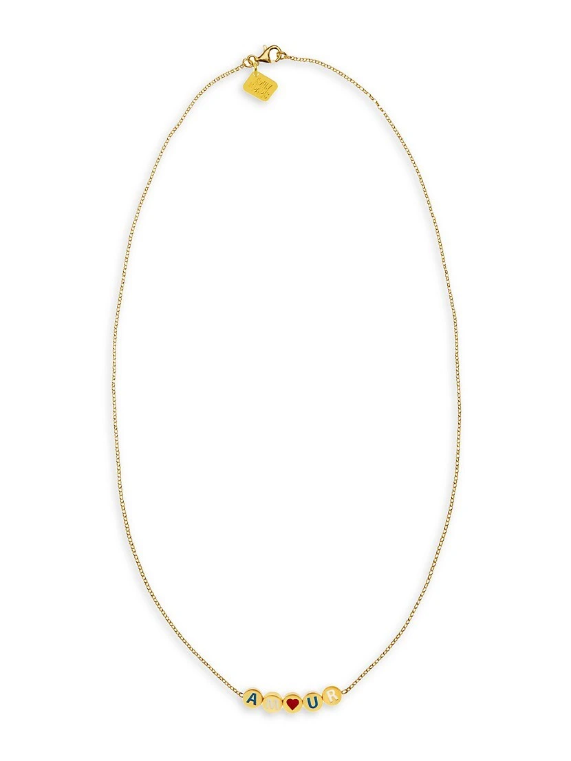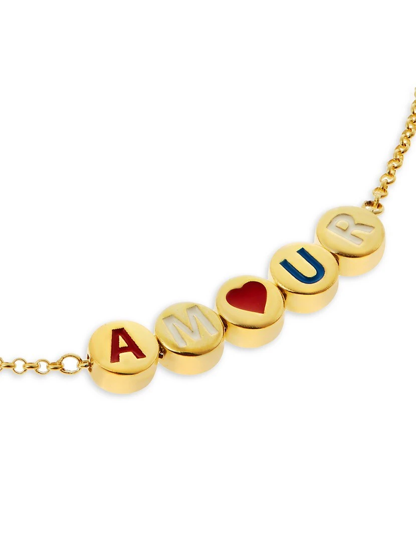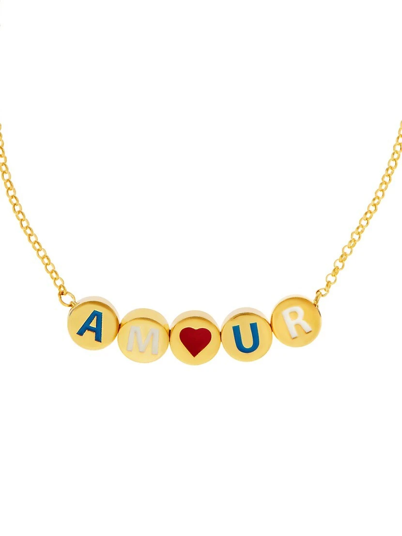 From the Emily In Paris Collection. Made of 18K gold-plated sterling silver, this whimsical necklace showcases five circular beads engraved with blue, white and red ‘Amour’ lettering.