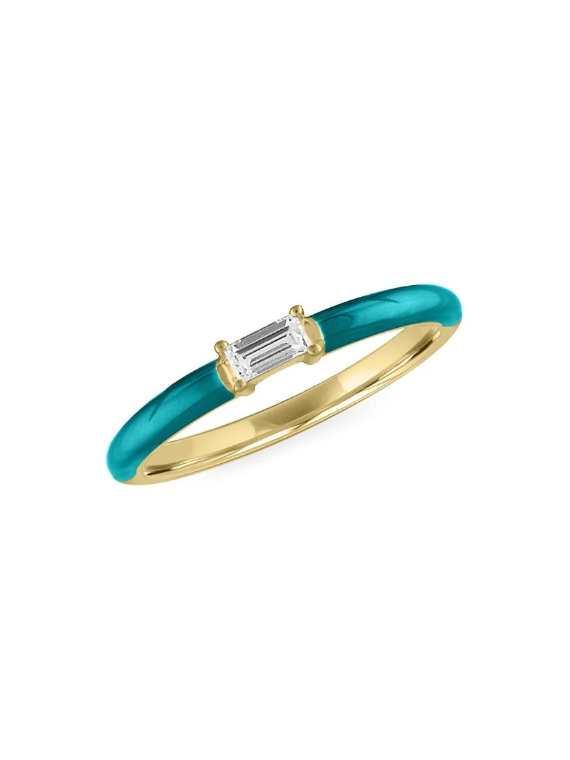 From the Enamel Collection. Create a beautiful stack with this vibrant gold ring featuring a shimmering baguette-cut diamond on a glossy turquoise band. Inspired by a mama’s love; born from the soul of adoption. A portion of all sales go to helpusadopt.org, a 5013c charity that helps those wishing to adopt.
