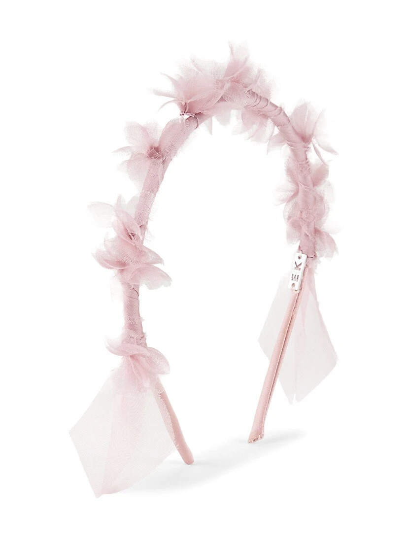 Crafted of silk, Eugenia Kim’s Aster slim headband is designed with decorative organza flower appliqués.