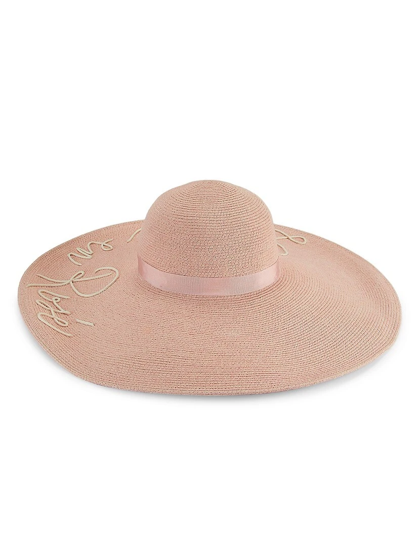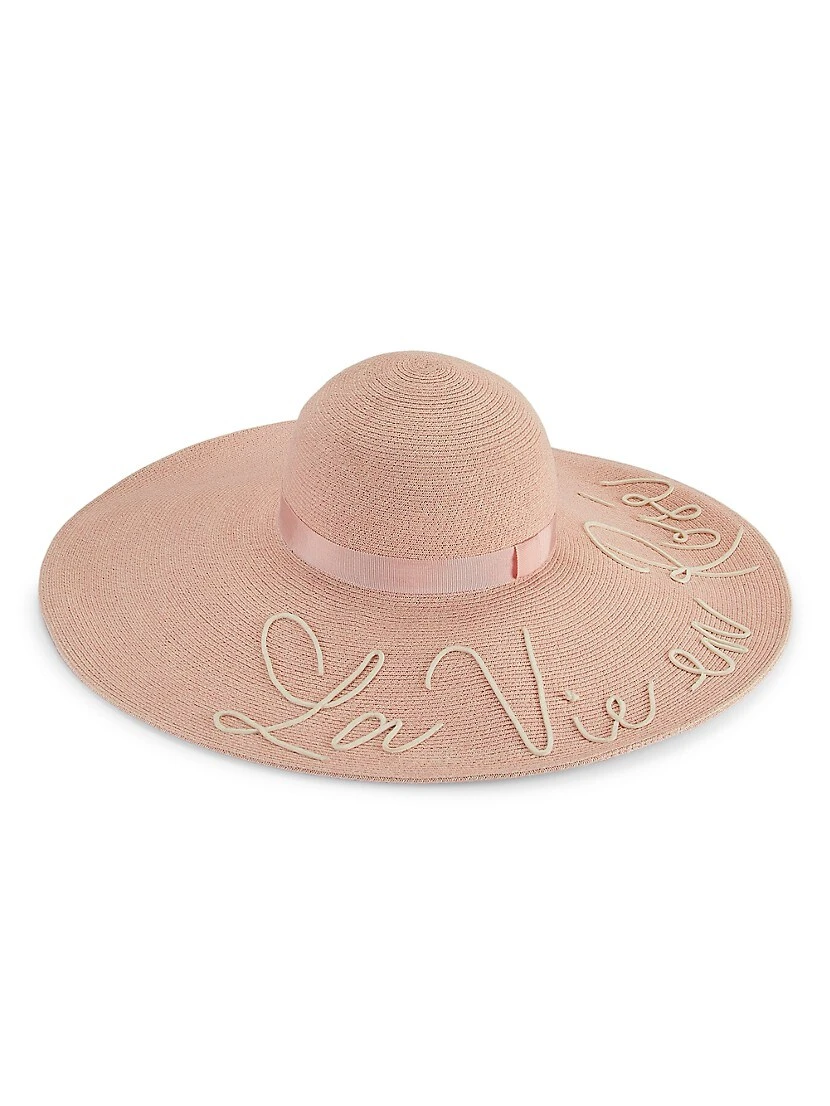 Eugenia Kim’s Sunny sunhat features a wide brim embroidered with “La Vie en Rosé” and a satin grosgrain ribbon.