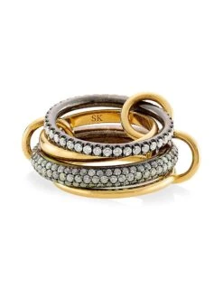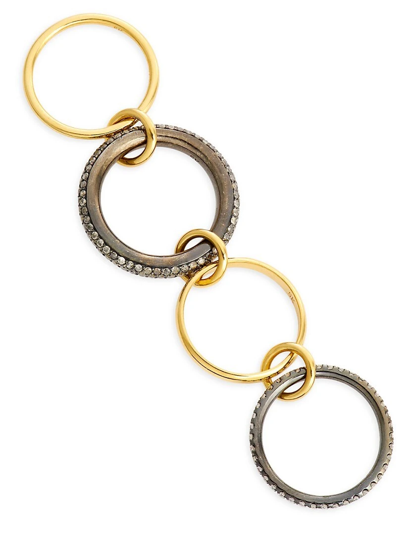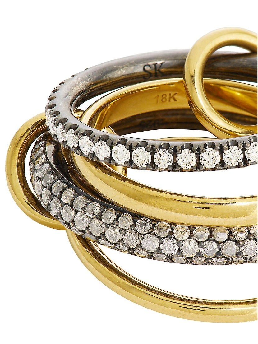 The Vega is composed of four linked rings in 18K yellow gold with pavé white and grey diamonds, black rhodium-plated prongs and 18K yellow gold connectors. Wear stacked one on finger or spread over multiple fingers.