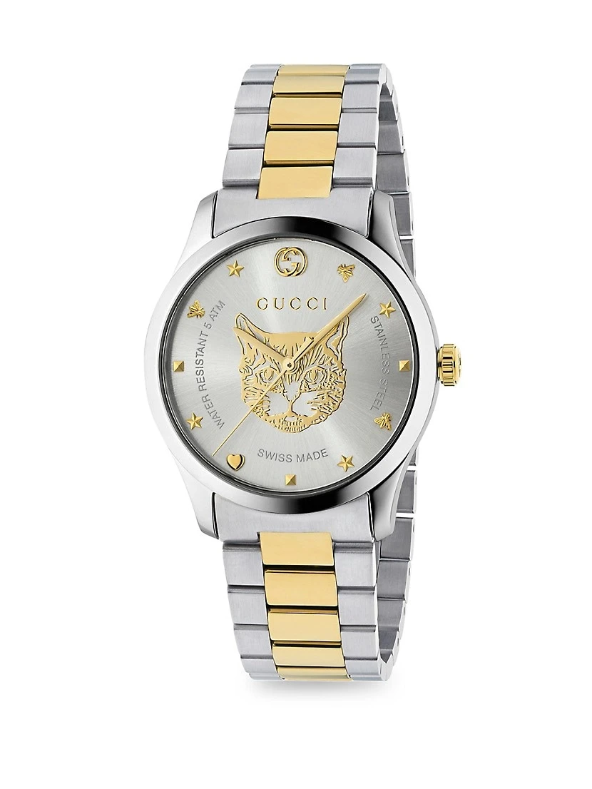 - Stunning steel timepiece featuring a cat face bezel in steel and yellow gold PVD