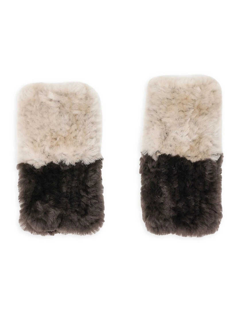 Pologeorgis’ fingerless gloves are knit with luscious colorblocked shearling.