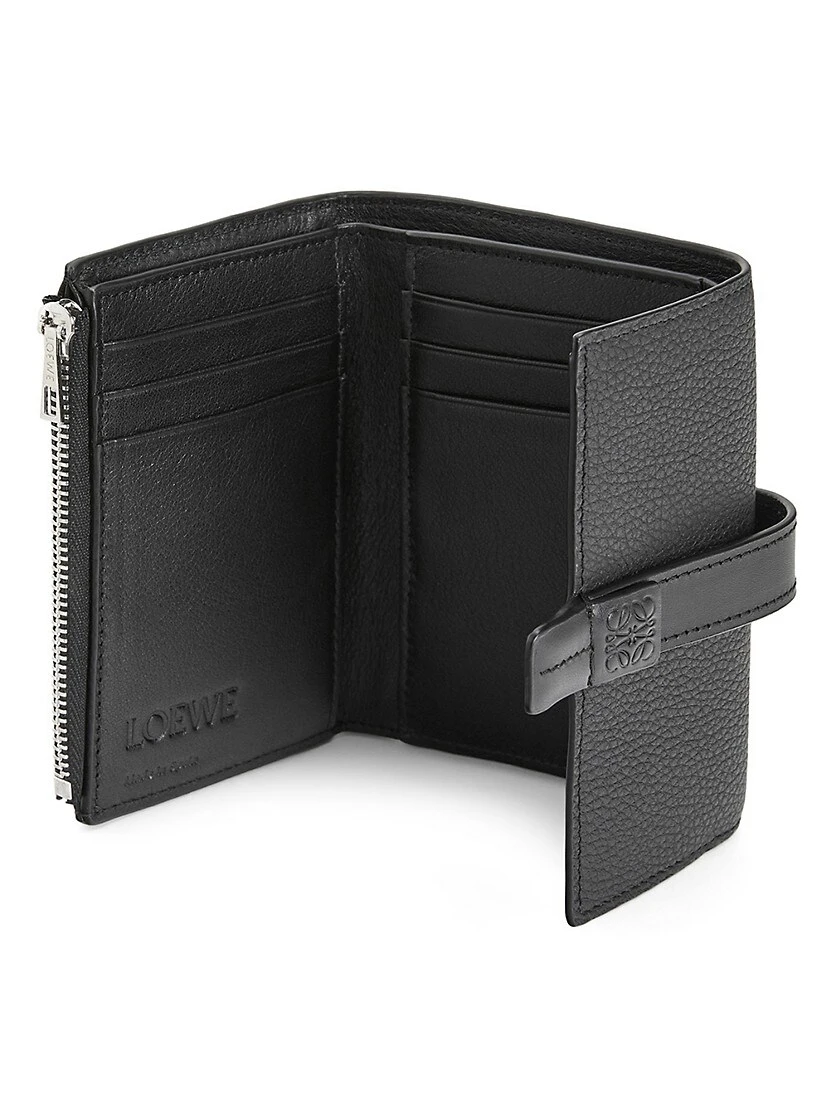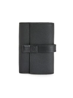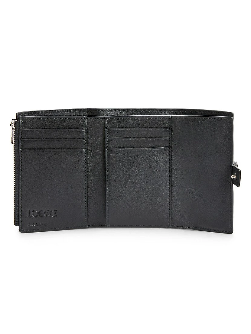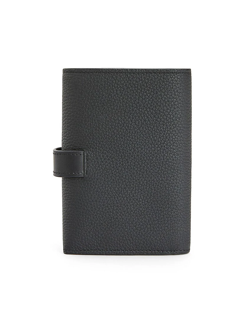 Grained leather tri-fold wallet featuring a contrast leather strap with embossed anagram logo.