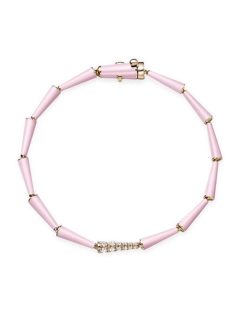From the Lola Collection. Melissa Kaye’s statement-making bracelet is crafted of 18K pink gold. This piece features sculpted links coated in pastel pink enamel and a single diamond-encrusted accent.