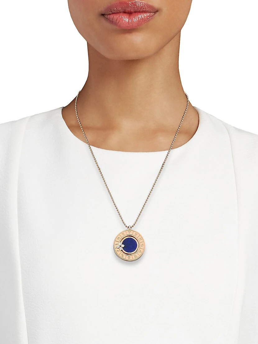 From Love in Verona Collection. This necklace is cast in 18K rose gold and features a blue lapis medalion with the zodiac signs etched along the border.