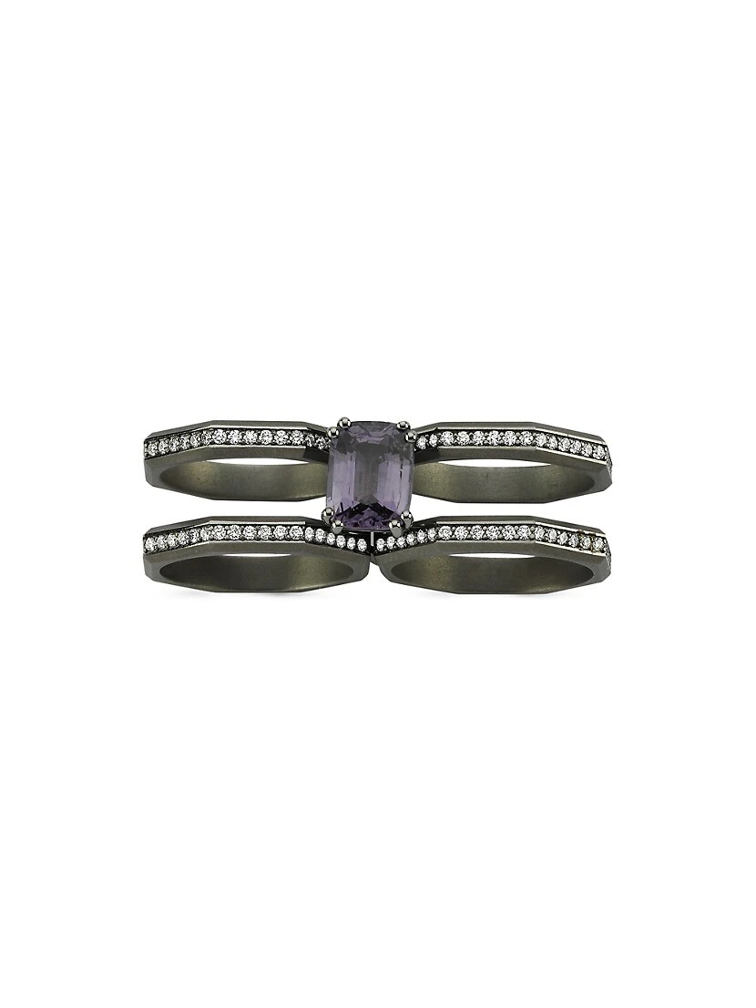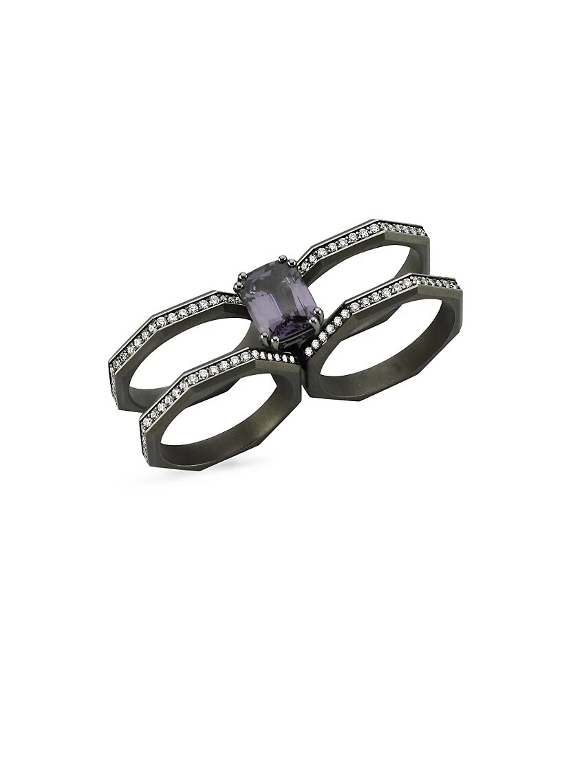 From the Luminescence Collection. Showcasing an octagonal silhouette, Ascher’s Supernova double-finger ring is crafted of 18K black gold set with a center emerald-cut gray spinel. Pavé diamonds add a radiant touch to this chic accessory.