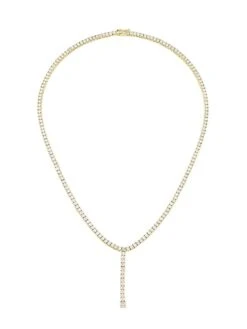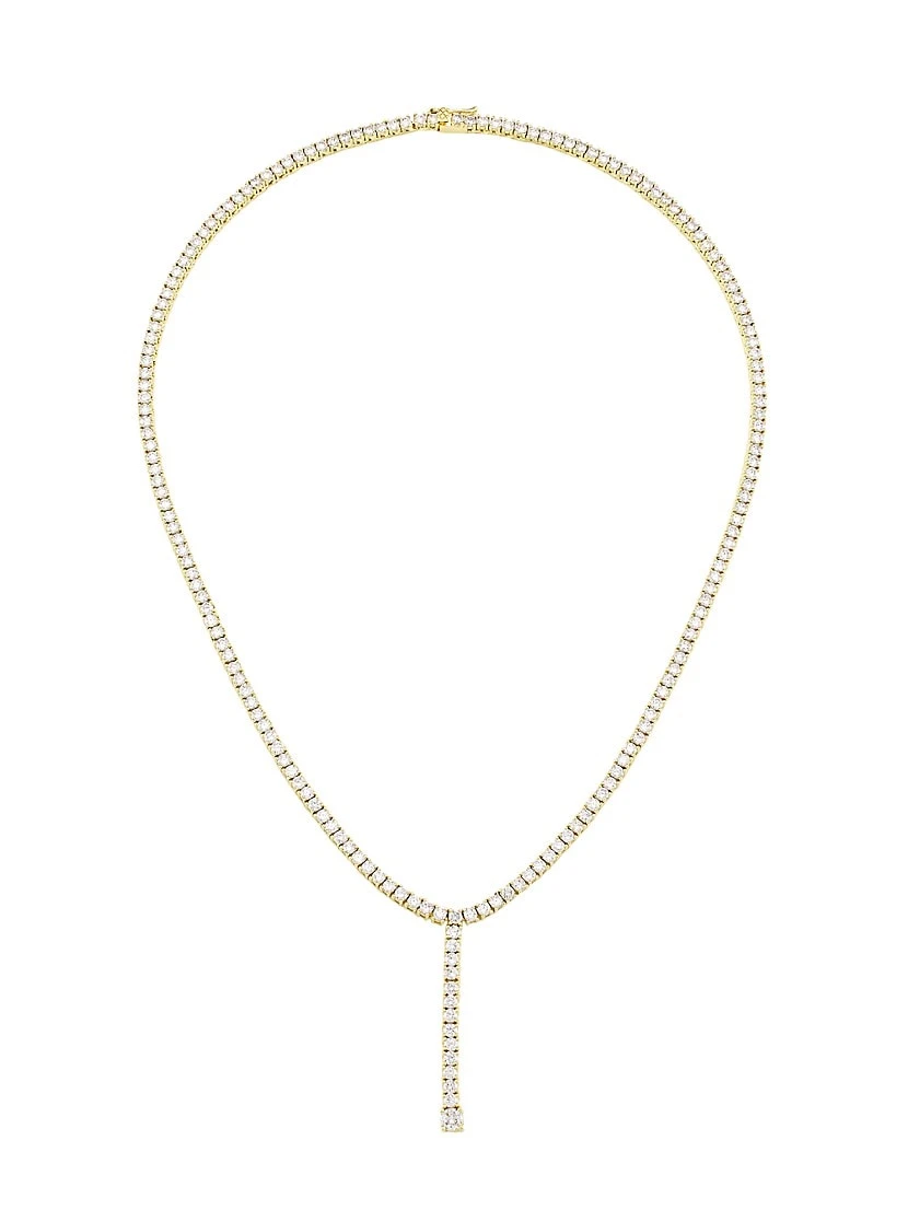 Crafted of goldtone metal, Luv AJ’s lariat necklace sparkles with white cubic zirconias.