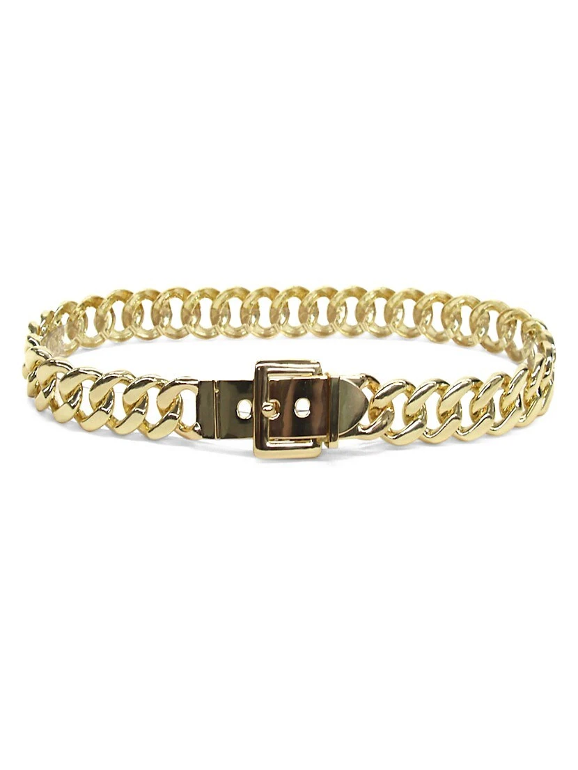 Gold tone chainlink belt with buckle closure.