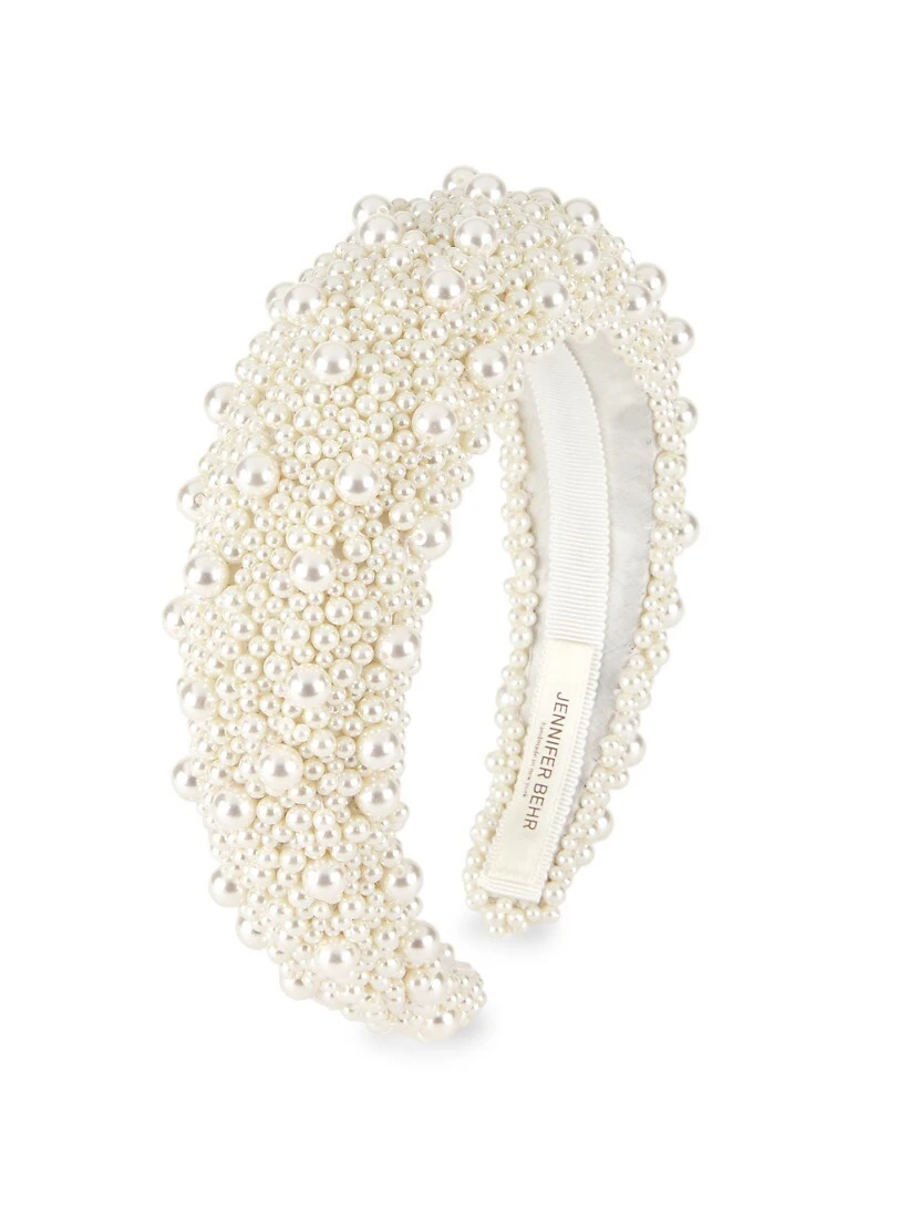 Jennifer Behr’s Marjeta headband is blanketed in luminous faux pearls from end to end on a headband base with extra height to make a statement.