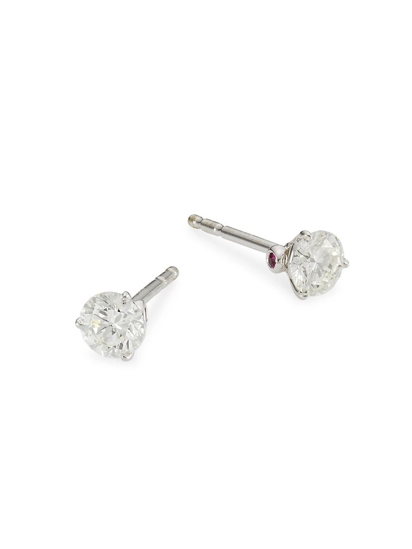 Crafted of 18K white gold, these elegant stud earrings are set with sparkling round white diamonds that rest in three-prong martini settings. Roberto Coin signs each piece with a single ruby placed in a hidden position.