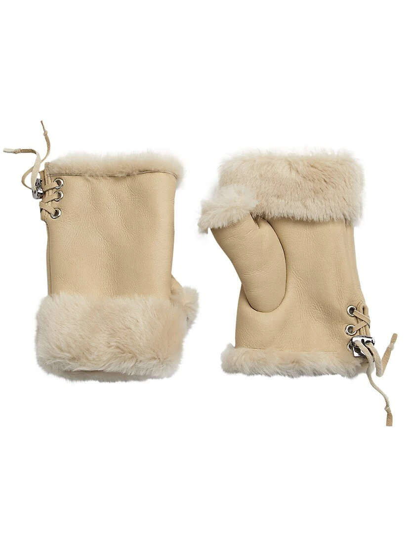 From the Maximilian Collection. These fingerless gloves from Maximilian are crafted of 100% lamb shearling. This warm style is finished with lace-up detailing at the cuff, silvertone hardware, and fur trim.
