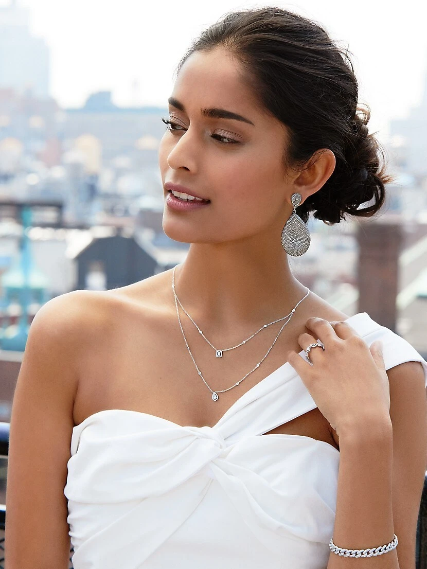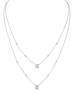 From My Twin Collection. Elegant dual diamond pendant necklace with bezel stations praise the diamond in all its shapes and cuts, and in partiuclar, the light effect between the pear and the emerald cut. Worn with a low V neckline, an opened shirt or a turtleneck, this diamond necklace nicely dresses the neck. The luminescent white gold enlightens the diamonds purity, enhancing their beautiful radiance.