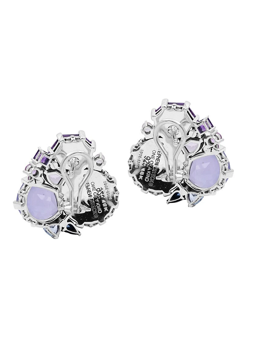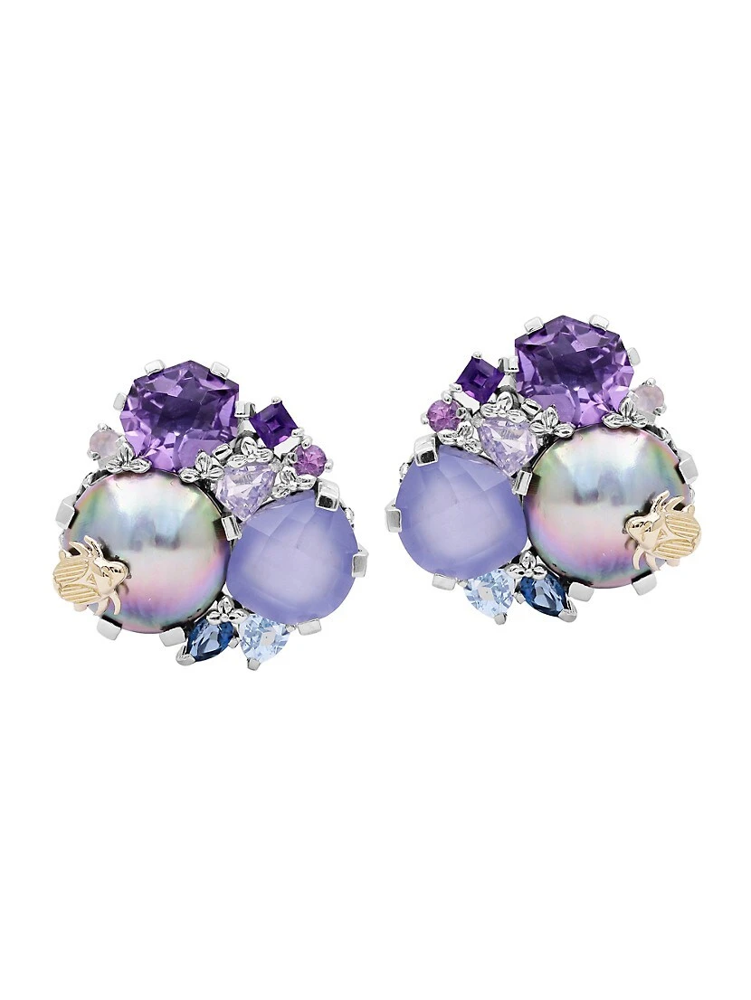 ONE OF A KIND. From the One-of-a-kind collection. The most coveted of the Stephen Dweck selection, the one-of-a-kind collection is based on the uniqueness and exclusivity of the natural world. No two pieces are alike, and the combination of signature hand-carved details, exceptional metalsmithing, and gemstones that cross continents, result in illustrious pieces that are both modern and collectible. These cluster earrings from Stephen Dweck feature genuine Tahitian mabe pearl, chalcedony, and amethyst.