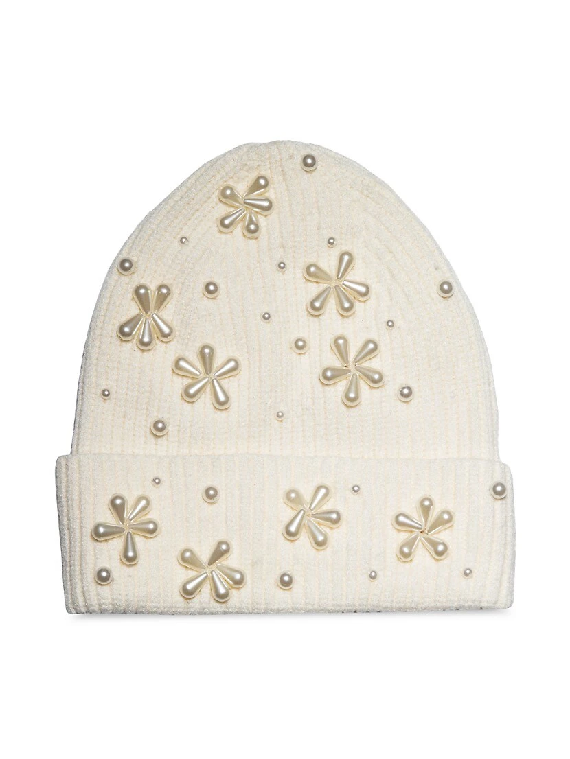 Lele Sadoughi’s rib-knit beanie is decorated with elegant faux pearls that create snowflake motifs.
