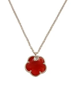 From the Petit Joli Collection. Pasquale Bruni’s 18K-rose-gold necklace features a vibrant carnelian flower pendant suspended from a fine cable chain. Accented with petite champagne and colorless diamonds, this stunning gemstone showcases the maison’s signature Bon Ton cut, distinguished by soft irregular facets at the five petals and a smooth cabochon center.