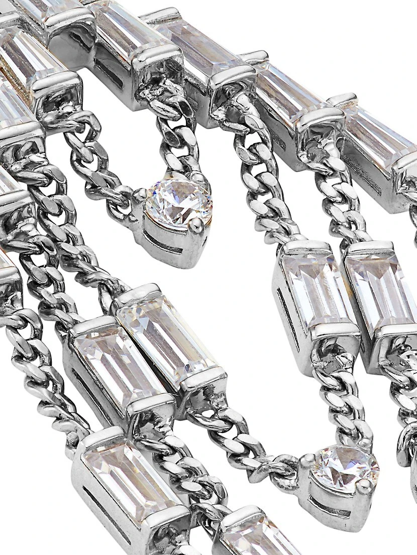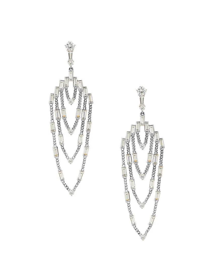 From the Revelry Collection. Made of rhodium-plated sterling silver, Adriana Orsini’s chandelier earrings showcase cascading curb chains embellished with sparkling round and baguette cubic zirconia.