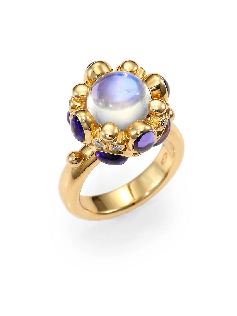 From the Royal Blue Moonstone Collection. An ornate design centering upon a royal blue moonstone cabachon, secured within a diamond and tanzanite-clustered setting, and balanced upon a smooth 18k gold shank with three-bead detail.