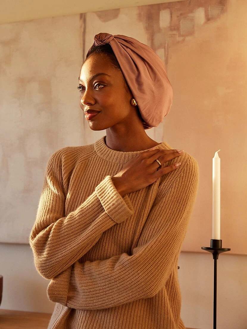 Gather hair and slide the turban overtop so that it covers the strands completely. Perfect for all hairstyles and hair types.