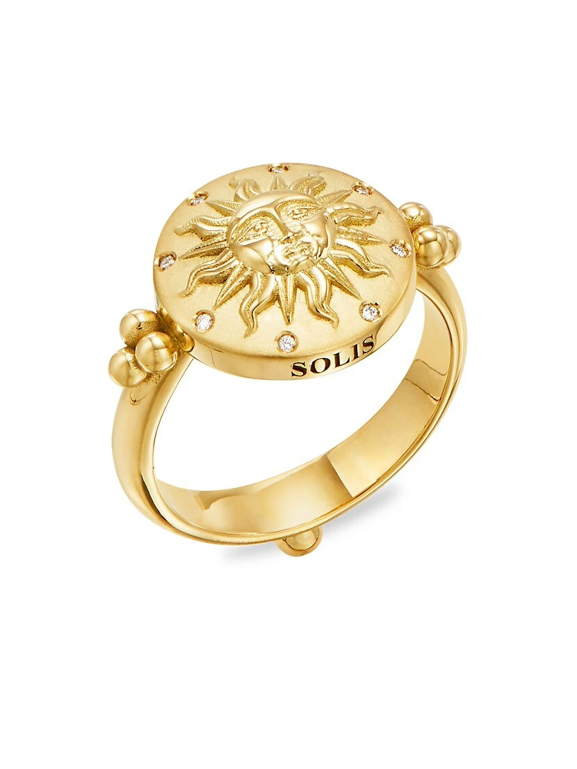From the Celestial Collection. Made of 18K yellow gold, this ring features a whimsical sun motif bordered by sparkling gypsy-set white diamonds.